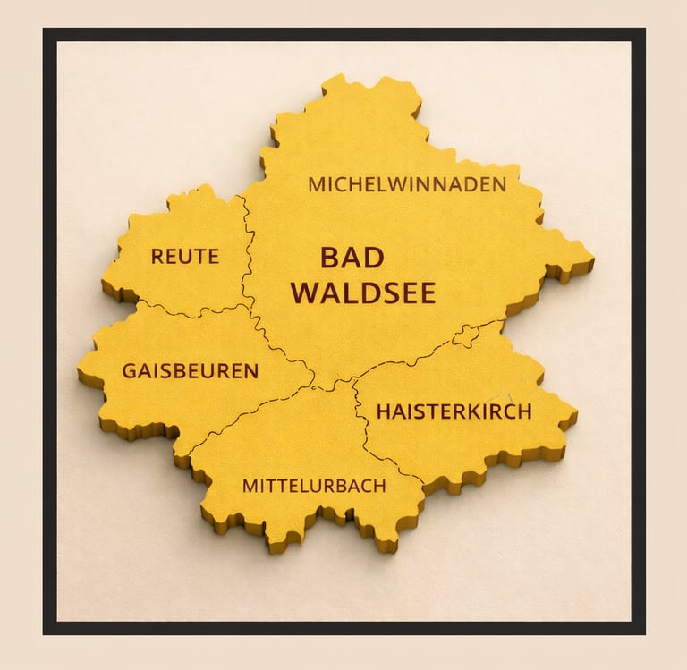 Unser Geschäftsgebiet umfasst speziell Bad Waldsee & Umgebung. Hier sind wir verwurzelt, kennen den Markt aus erster Hand und sind täglich für unsere Kundinnen und Kunden im Einsatz.
